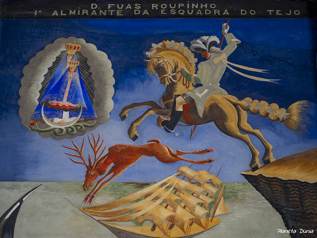 Este panel evoca la leyenda medieval de D. Fuas Roupinho, un noble caballero portugués salvado milagrosamente por la Virgen en el promontorio de Nazaré. El protagonista de la Leyenda de Nazaré se muestra en una historia de milagro y misterio vinculada a la región de Sintra. Almada Negreiros la interpreta con una mezcla de solemnidad y poesía visual, conjugando elementos históricos y simbólicos con escenas de la vida cotidiana en la costa lisboeta.